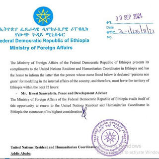 አዲስ አበባ፣ መስከረም 20፣ 2014 (ኤፍ ቢ ሲ) በአትዮጵያ የዓለም ህጻናት አድን ድርጅት ጽህፈት ቤት (ዩኒሴፍ) እና በተመድ የሰብዓዊ አገልግሎት ማስተባበሪያ ጽህፈት ቤቶች ውስጥ በተለያዩ ሃላፊነት ሲሠሩ የነበሩ እና በኢትዮጵያ የውስጥ ጉዳይ ጣልቃ በመግባት ህገ ወጥ ሥራ ሲሠሩ የተገኙ የውጭ ሃገር ዜጎች በ72 ሰዓታት ውስጥ ከአገር እንዲወጡ መታዘዙን የኢፌዴሪ የውጭ ጉዳይ ሚኒስቴር አስታውቋል፡፡